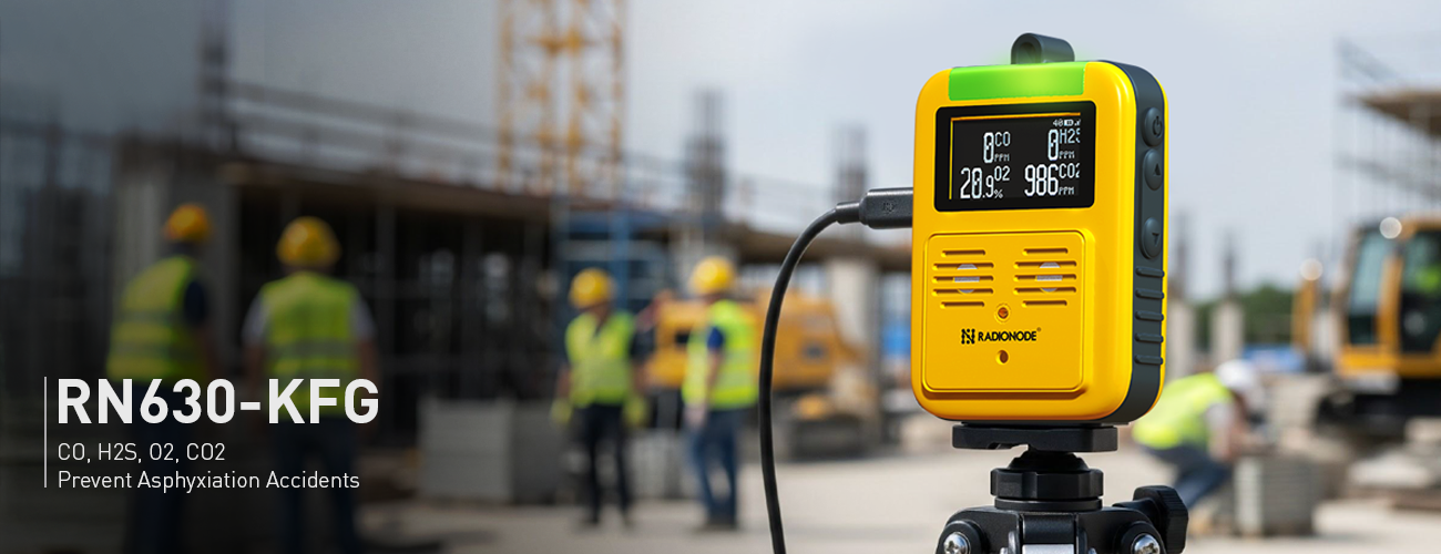 RN630-KFG는 작업자 안전 확보를 위해 설계된 휴대형 스마트 센서입니다. CO, CO₂, O₂, H₂S를 동시에 측정하고 온도·습도, Man-Down(무반응)·SOS까지 통합 감지합니다.